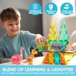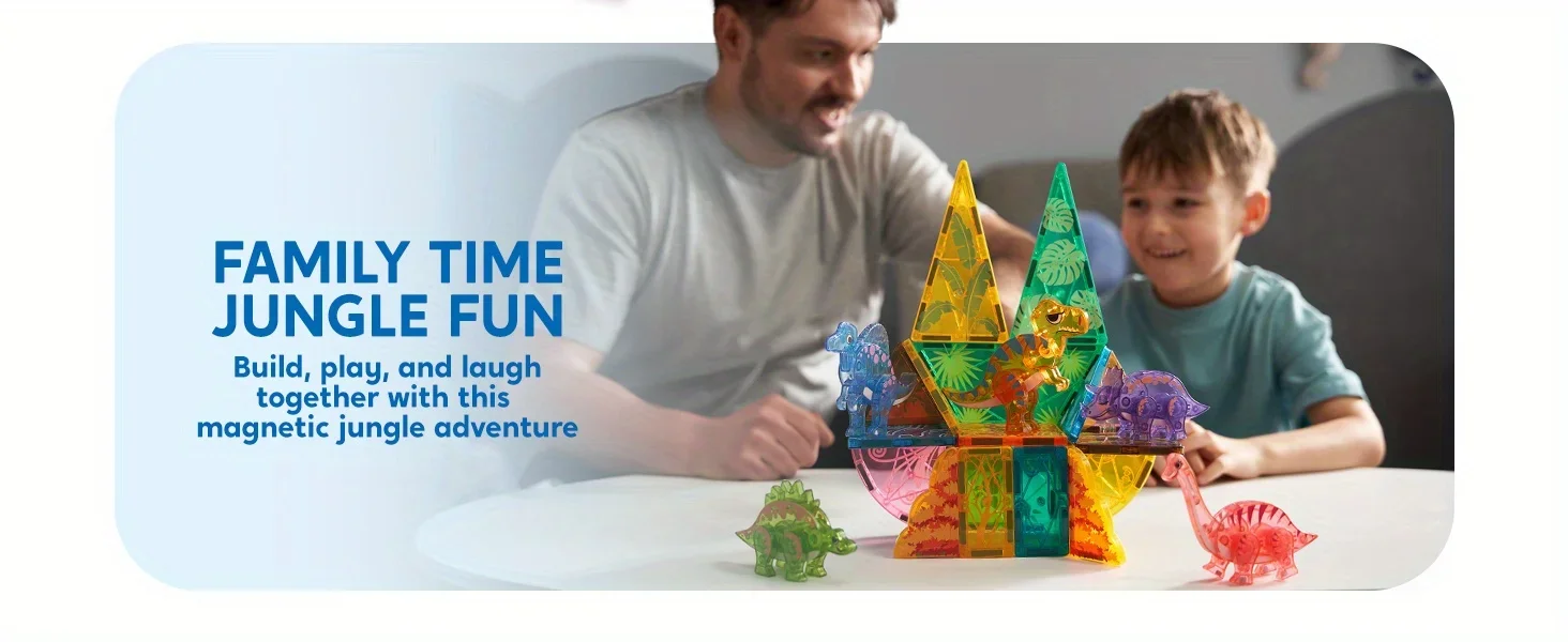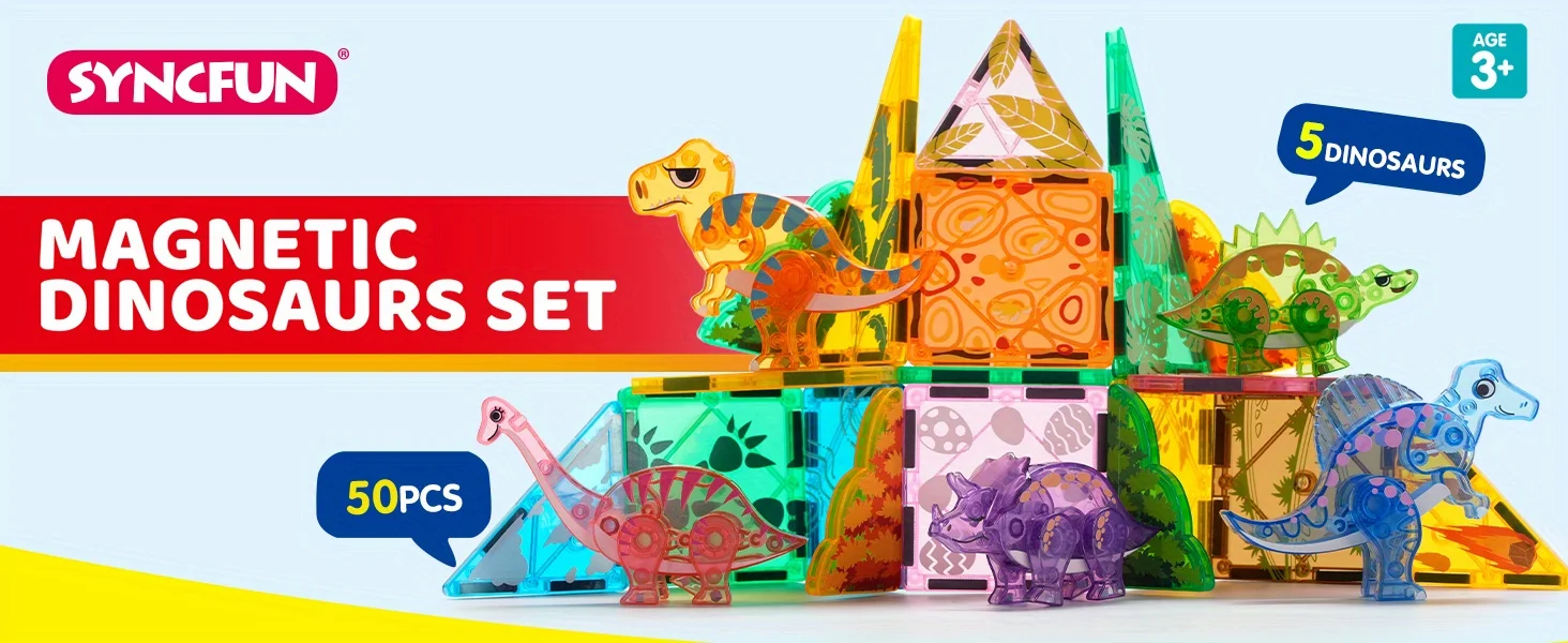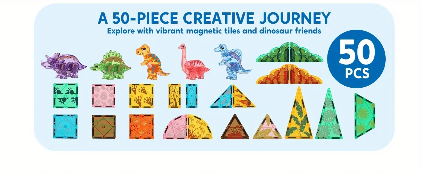 Rich Accessories: Includes 50 pieces, featuring T-Rex, Spinosaurus, Triceratops, Stegosaurus, and Brachiosaurus. The diverse magnetic building tiles and dinosaur figures inspire kids’ imaginations, allowing them to create and customize various dinosaur landscapes.