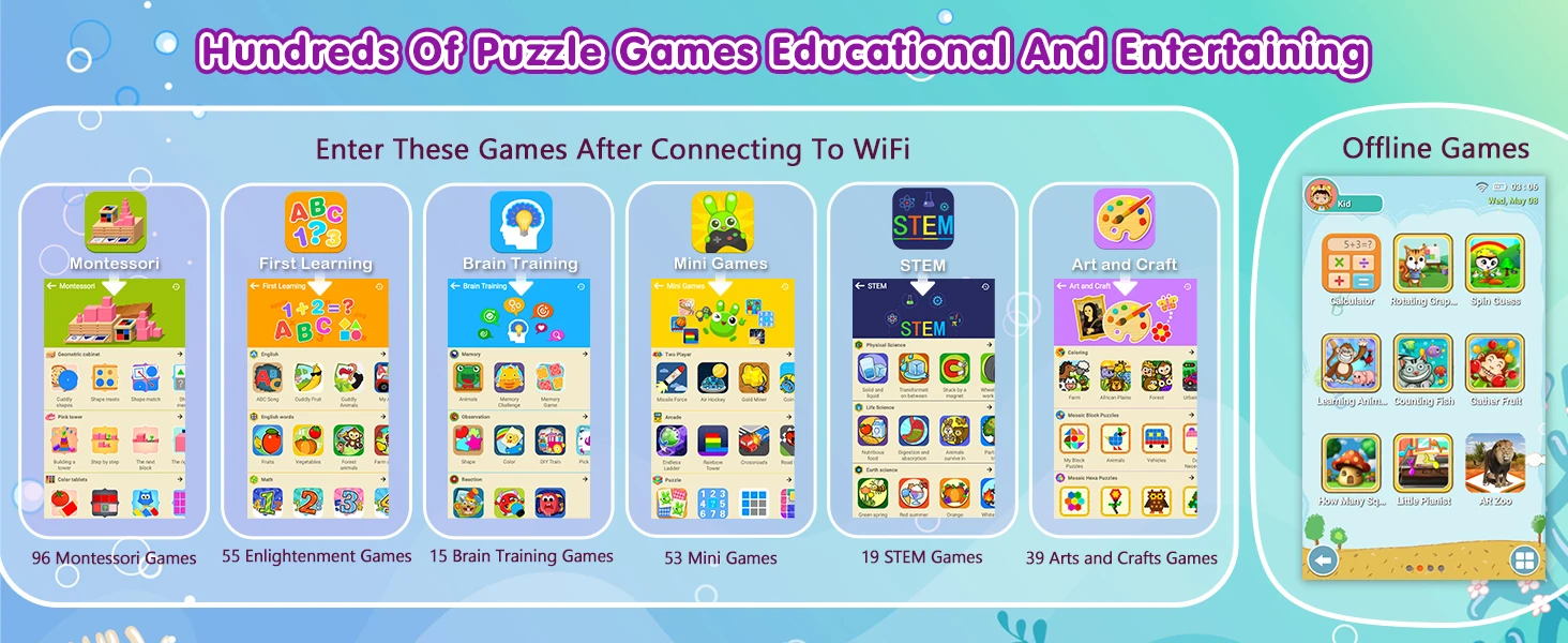 Internet-enabled Smartphone – Kids toy phone has built-in multiple offline games that can be played. After connecting to the Internet, the puzzle game library is automatically unlocked, providing more than 100 educational games suitable for children, which is conducive to promoting children's intellectual development and entertainment experience. At the same time, it can also browse the Internet, and children can surf the Internet under the supervision of their parents to explore more knowledge.